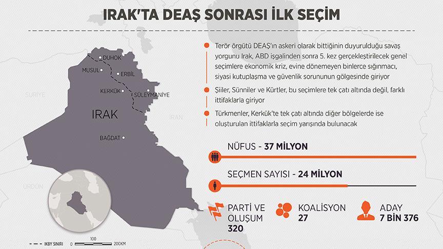 Terör örgütü DEAŞ'ın askeri olarak bittiğinin duyurulduğu savaş yorgunu Irak, ABD işgalinden sonra 5. kez gerçekleştirilecek yarınki genel seçimlere ekonomik kriz, evine dönemeyen binlerce sığınmacı, siyasi kutuplaşma ve güvenlik sorununun gölgesinde giriyor.