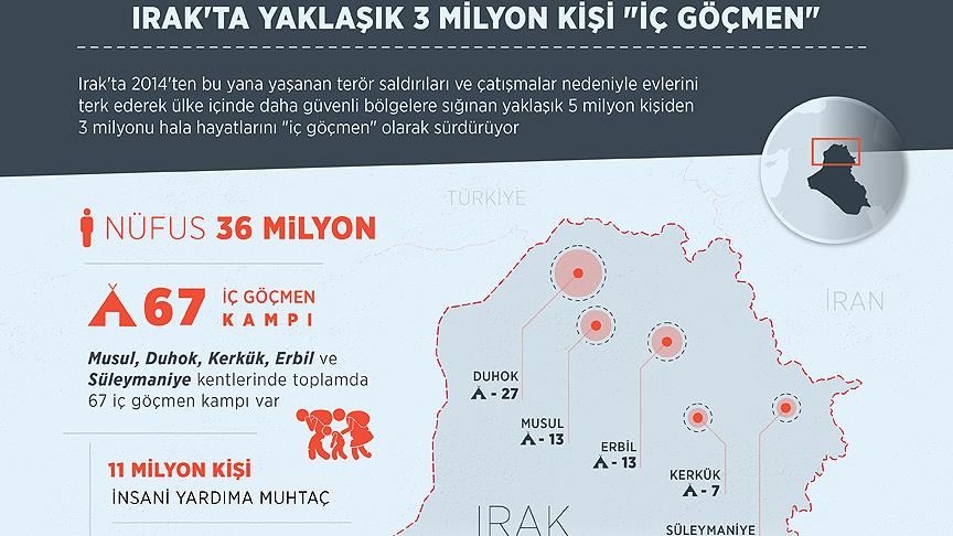 Birleşmiş Milletler (BM) verilerine göre 36 milyonluk nüfusun 11 milyonunun insani yardıma ihtiyaç duyduğu Irak'ta, son 3 yılda yaklaşık 5 milyon kişi evlerini terk ederek daha güvenli olan ülkenin kuzey bölgelerine sığınmak zorunda kaldı.