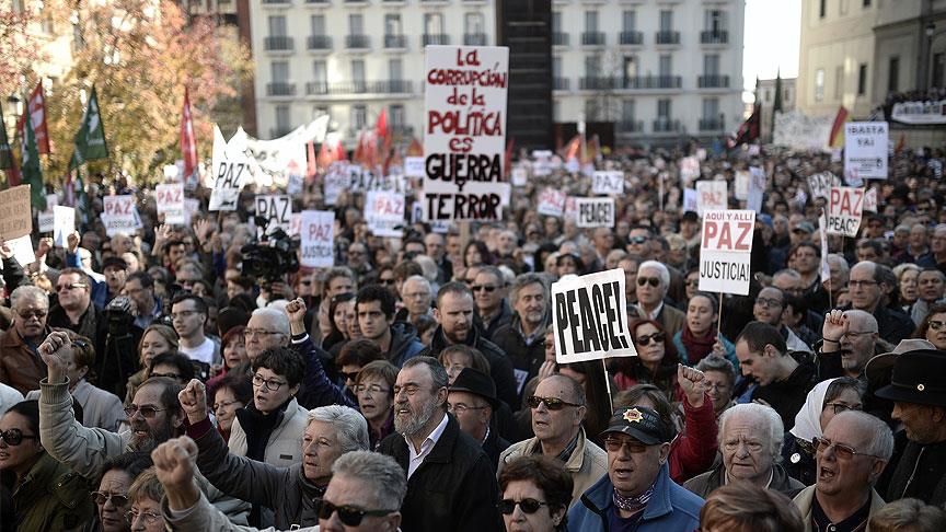 Başkent Madrid'deki Reina Sofia Müzesi önünde düzenlenen gösteride, "Savaşa hayır", "Bizim adımıza değil", "Paris'teki saldırıların acılarına rağmen sorun daha çok şiddetle çözülmez" sloganları atılarak, Suriye'de barışçıl ve siyasi bir çözüm bulunması çağrıları yapıldı.