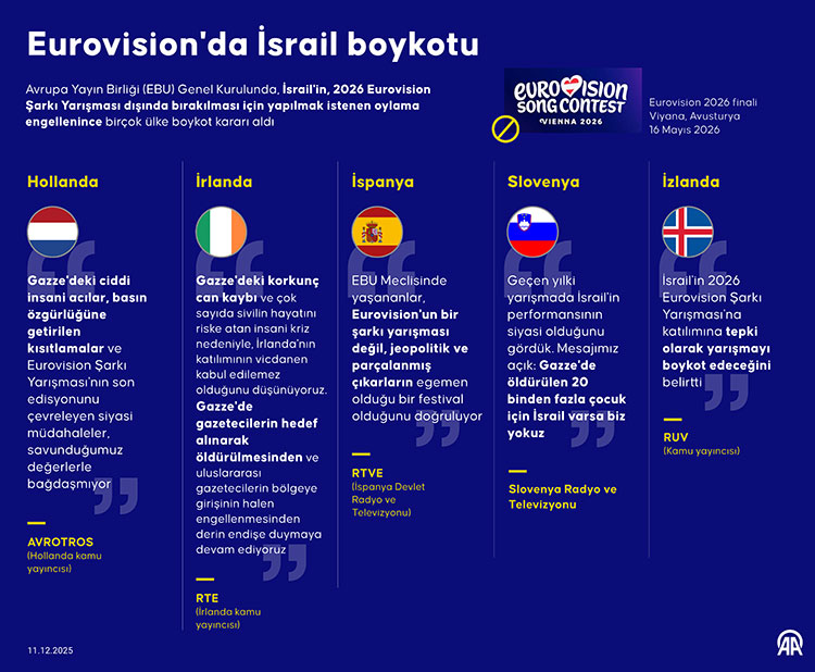 Açıklamada, Gazze'de 2 yılı aşkın süredir devam eden soykırıma, ateşkese rağmen her gün devam eden saldırılarına rağmen İsrail'in yarışmaya katılmasına izin verildiği, bu yüzden Eurovision'u boykot etme kararı alan ülkelerin bulunduğu hatırlatıldı.