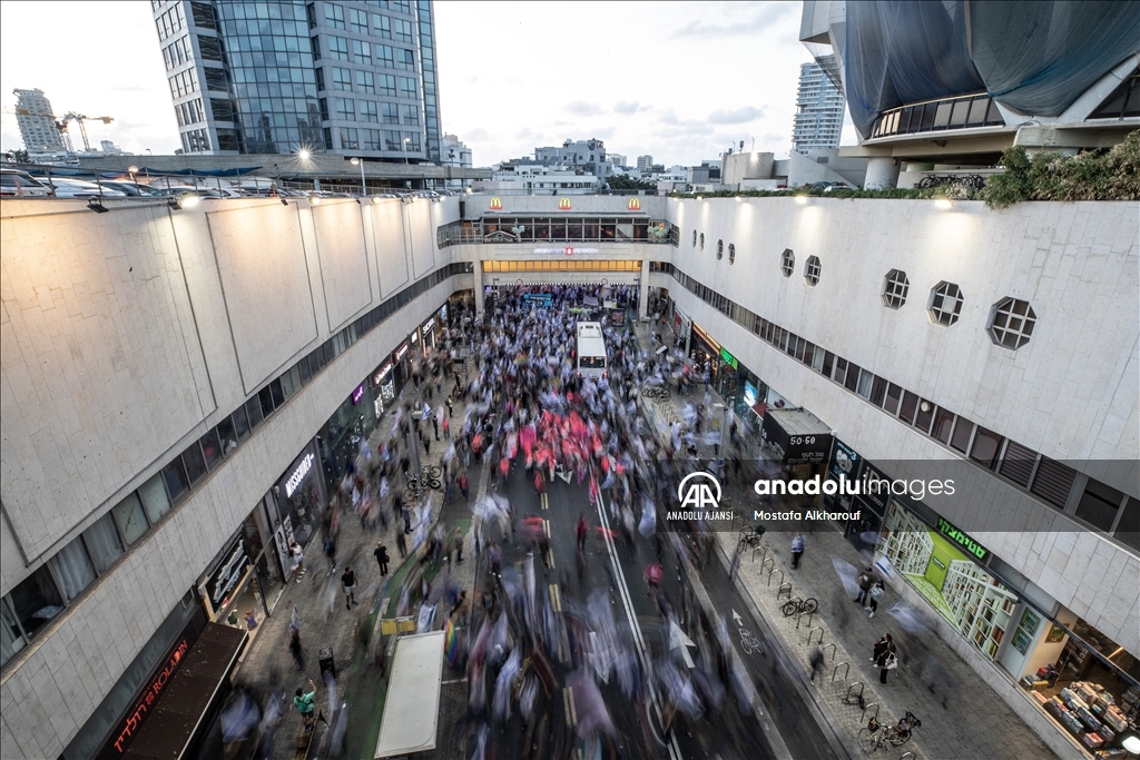 Her hafta olduğu gibi en yoğun katılımlı gösteriye ev sahipliği yapan Tel Aviv'de binlerce protestocu, Kaplan Caddesi'ndeki Hükümet Kompleksi'nin önünde toplandı.