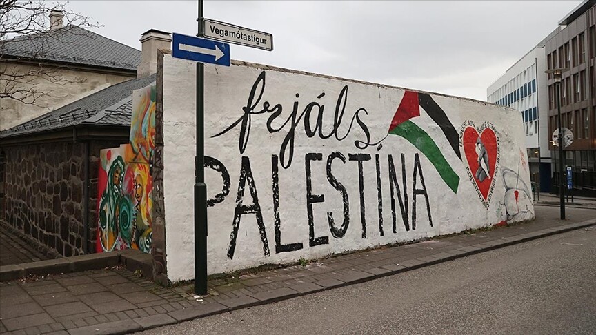 Anlık gelişmeler için AA Canlı Duvarın büyük bir bölümünde el yazısıyla yazılmış "Özgür Filistin" anlamına gelen İzlandaca "Frjals Palestina" ifadesi yer alıyor. Yazının yanında ise Filistin bayrağı bulunuyor.