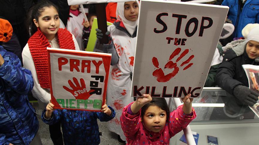 Kanada hükümeti tarafından geçen sene ülkeye getirilen 25 binden fazla Suriyeliden, Hamilton'da yaşayan yüzlercesi, Halep'teki insanlık dramı için sokağa döküldü.