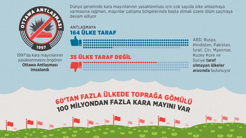 Kara mayınlarının yasaklanması için 19 yıl önce çok sayıda ülke anlaşmaya varmasına rağmen hala 60'tan fazla ülkenin topraklarında bulunan mayınlar, çatışma bölgeleri başta olmak üzere her yıl çok sayıda insanın hayatını tehlikeye atıyor.