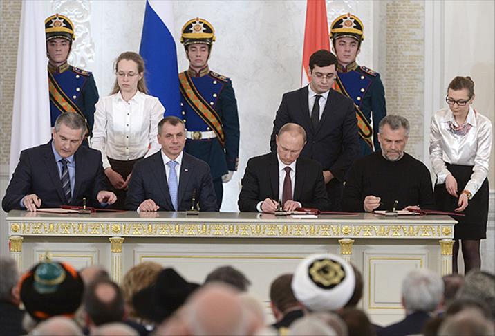 Anlaşmayı, Putin, Kırım Başbakanı Sergey Aksenov, Sivastopol Belediye Başkanı Aleksey Çalıy, Kırım Meclis Başkanı Vladimir Konstantinov imzaladı.