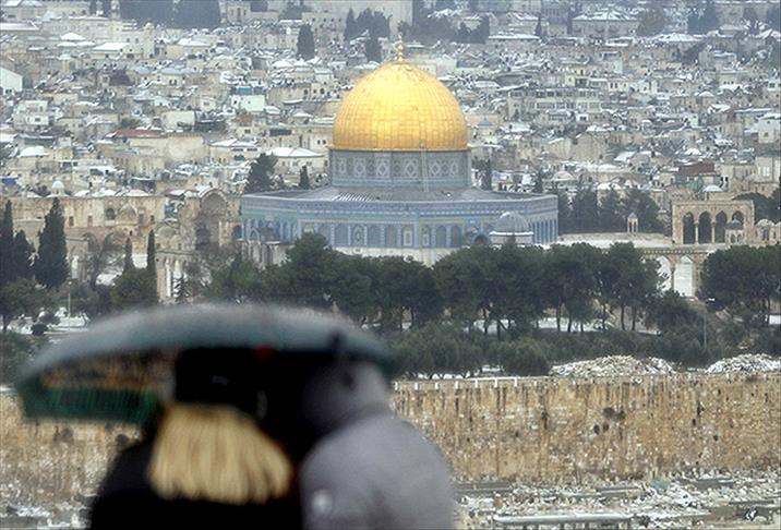 Kudüs'te Cuma namazının ardından başlayan kar, şehrin yüksek semtlerini yer yer beyaza bürürken, Mescid-i Aksa çevresinde güzel manzaralar oluştu.