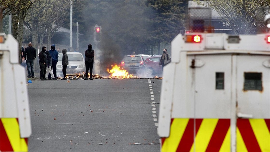 Kuzey İrlanda'nın başkenti Belfast’ta, Avrupa Birliği (AB) ile varılan Brexit anlaşması gereği Kuzey İrlanda ve Birleşik Krallık'ın geri kalanı arasında ticarete sınırlama getiren düzenlemeye karşı devam eden şiddet olaylarında birlik yanlıları düzenledikleri protesto gösterisi sırasında polise taşlarla saldırdı. Göstericiler yaktıkları çöp ve eşyalarla Lanark Yolu'nu kapattı. ( Conor Mccaughley - Anadolu Ajansı )