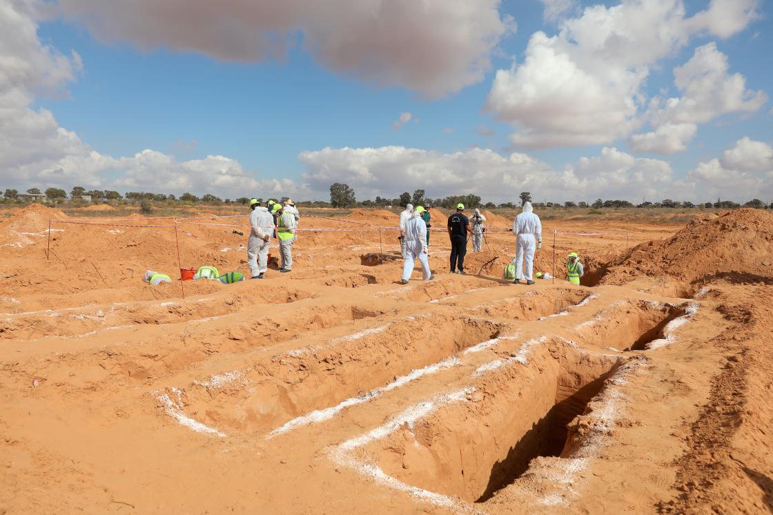 Libya'nın Terhune kentinde zeytinliklerle çevrili tarımsal Rabıt bölgesinde adli tıp ekiplerinin çalışmaları sürerken, bölge kazıldıkça yeni cesetler de çıkmaya devam ediyor.