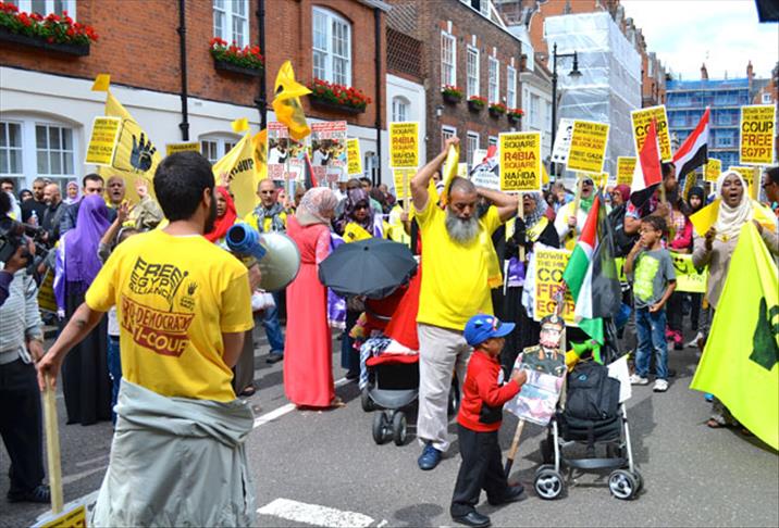 "Rabia London" adlı organizasyon tarafından düzenlenen gösteride, Mısır'ın Londra Büyükelçiliği önünde bir araya gelen yaklaşık 150 kişilik grup, Rabiatul Adeviyye ve Nahda meydanlarındaki katliamı ve Gazze halkının yaşadıklarını Arapça, "Sisi korkaksın, Amerika içinsin", "Sisi sionistsin, Gazze gözümüzün önünde" İngilizce olarak da, "Hey Sisi gitmeli", "Özgür Mısır", "Ordu devleti istemiyoruz", "David Cameron görmüyor musun? Sisi demokrasiyi öldürdü" sloganları atarak protesto etti.