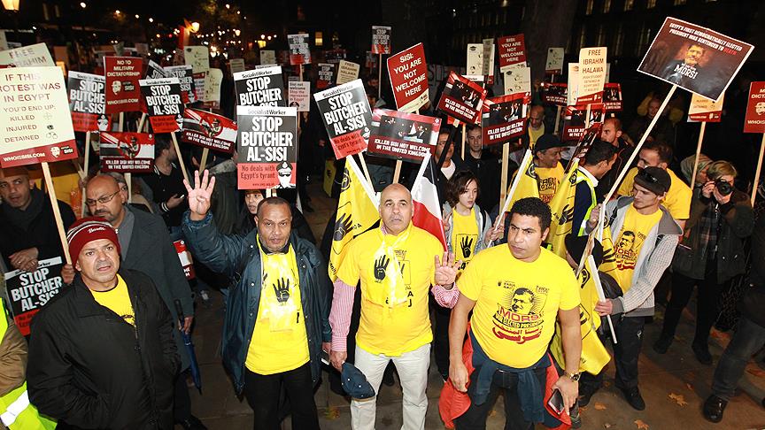 Londra polisinin yoğun güvenlik önlemleri aldığı protestoda katılımcılar, İngiliz hükümetinin Sisi'yi Londra'ya davet etmesine tepki gösterdi. Grup, İngiltere Başbakanı David Cameron'a, Sisi ile görüşmeme çağrısında bulundu.