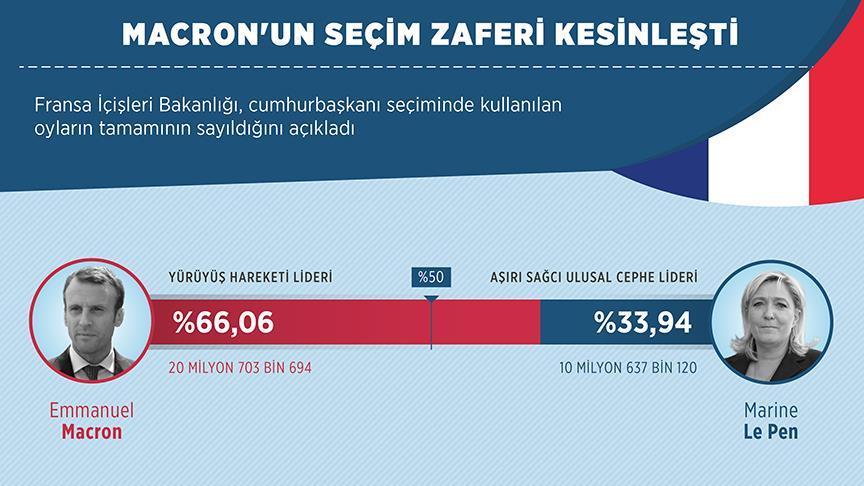 Açıklamada, Macron'un oyların yüzde 66,06'sını aldığı, Le Pen'in yüzde 33,94'te kaldığı ifade edildi.