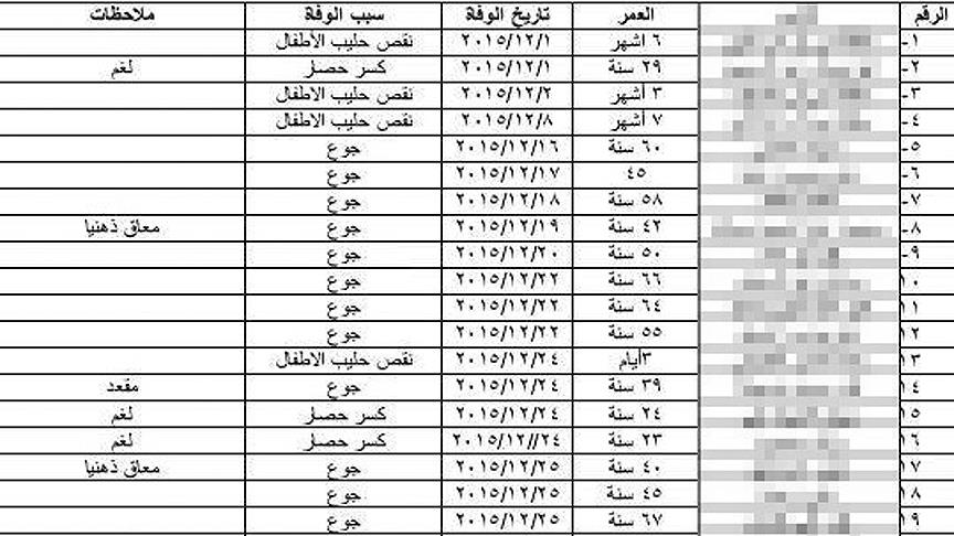 AA muhabirinin Madaya sağlık heyetinden edindiği sağlık raporuna göre, Aralık ayında 6'sı çocuk 23 kişi açlıktan, 8 kişi de beldeden kaçmaya çalışırken Hizbullah'ın belde çevresine döşediği mayınlar sonucunda yaşamını yitirdi.