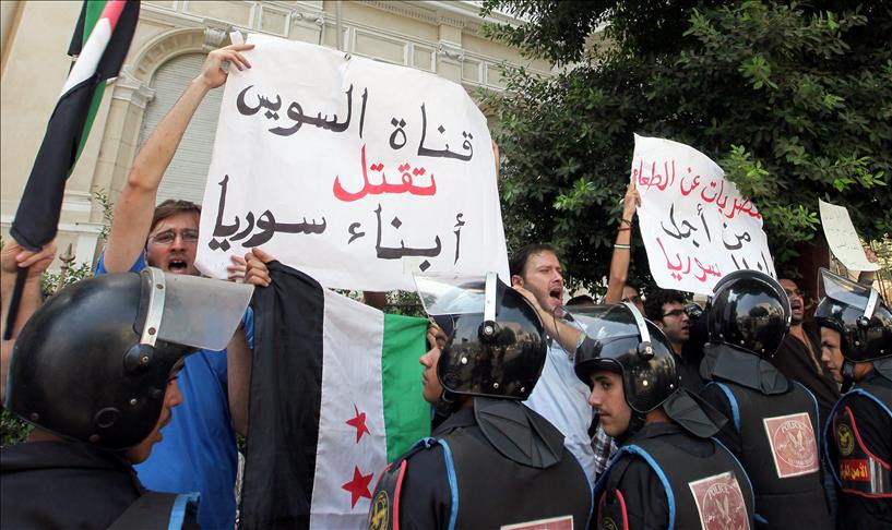 Kahire'de düzenlenen, Arap Birliği Daimi Temsilciler düzeyindeki 138. oturum sırasında Arap Birliği Genel Sekreterliği önünde toplanan göstericiler, ''Mursi son noktayı koy'', ''Mursi, Müslümanlığını göster'', ''Süveyş kanalı Suriye'nin yıkımı ve çocukların ölümüne ortak oldu'' ve ''Suriyeli kadınlar istekleri gerçekleşene kadar açlık grevinde'' yazılı pankartlar taşıdı.