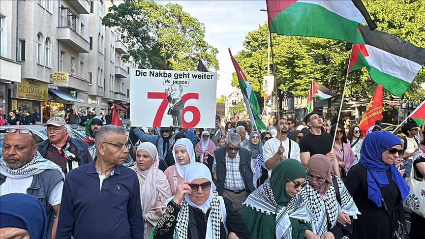 Berlin’deki Birleşik Filistin Komitesinin "Nekbe 76 Savaşı durdurun, İsrail’e silah verilmesin" sloganıyla düzenlediği yürüyüş için yaklaşık bin gösterici, Wilmersdorf metro istasyonu önünde toplandı.