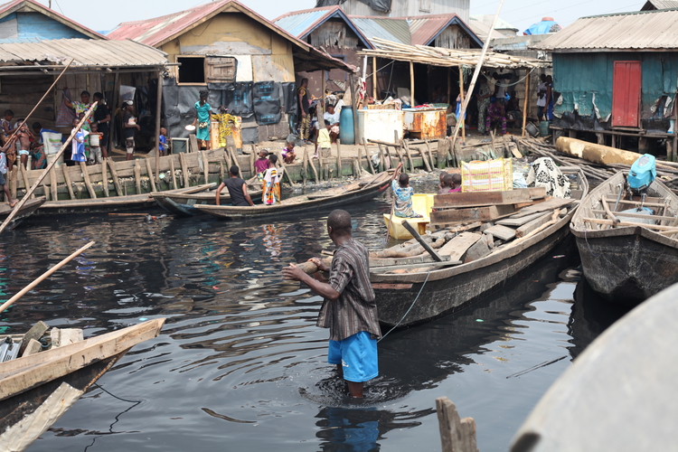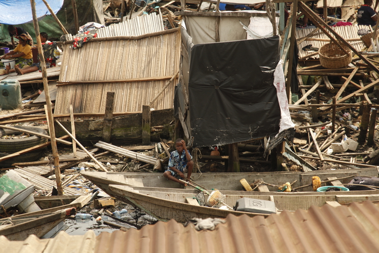 Nijerya'nın Lagos eyaletine bağlı Makoko kentinde yer alan Lagos Lagünü üzerinde kazıklar üzerine inşa edilen ahşap evlerin hükümet tarafından yıkılması sonucu evsiz kalan yüzlerce aile, kanolarda yaşam mücadelesi veriyor.