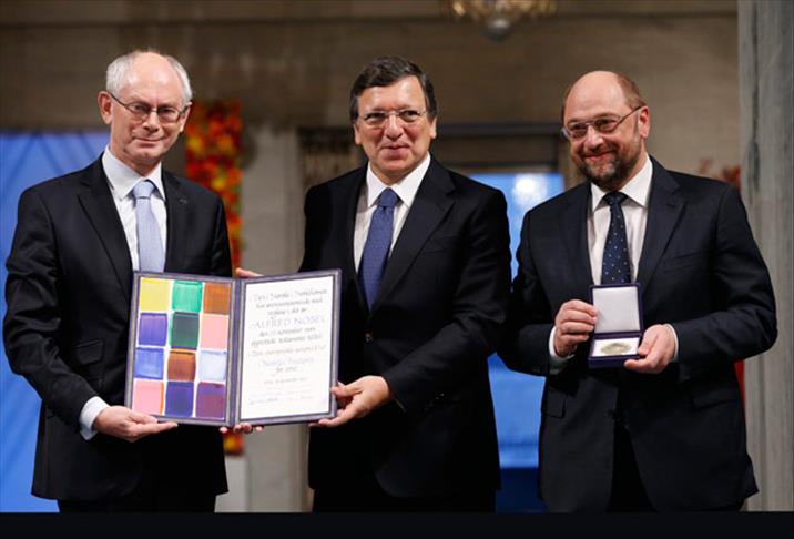 Bu yıl Nobel Barış Ödülü'ne layık görülen Avrupa Birliği'nin (AB) ödülünü, Birlik adına AB Komisyonu Başkanı Jose Manuel Barroso, AB Konseyi Başkanı Herman Van Rompuy ile Avrupa Parlamentosu (AP) Başkanı Martin Schulz aldı.
