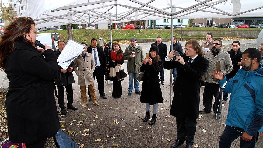 Eberplatz Meydanı'nda toplanan göstericiler Almanya'da, 2000-2007 yıllarında 8'i Türk 10 kişiyi öldüren NSU terör örgütünü protesto edip, tek tek isimlerini okudukları kurbanlar için dua etti.