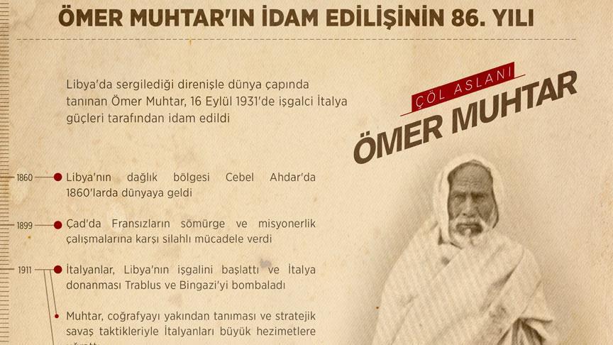 Libya'da işgalci İtalyan güçleri karşısında sergilediği direnişle dünya çapında bir sembole dönüşen ve "Çöl Aslanı" olarak anılan Ömer Muhtar'ın idam edilişinin üzerinden 86 yıl geçti.