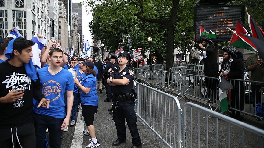 ABD'de yaşayan Ortodoks Yahudileri ve bir grup Filistinli, New York'un Manhattan bölgesinde İsrail yanlıları tarafından düzenlenen "İsrail'i kutlama" yürüyüşünü protesto etti.