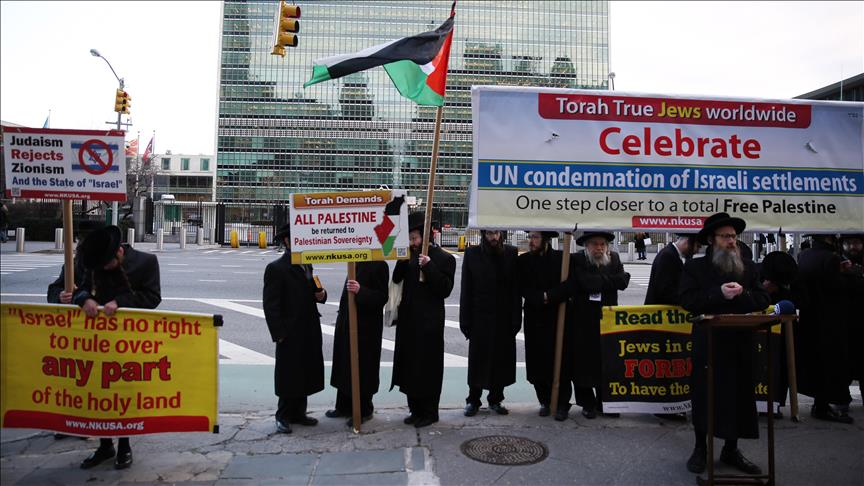 "Siyonizme Karşı Ortodoks Yahudileri"nden oluşan grup, İsrail'in yasa dışı yerleşim yerleri inşasını kınayan tasarıyı kabul eden Birleşmiş Milletler Güvenlik Konseyini (BMGK), Birleşmiş Milletler (BM) karşısında düzenledikleri gösteriyle kutladı.