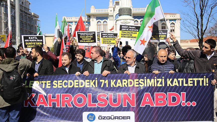 Saraçhane Parkı'nda toplanan grup, ellerinde "Halep'te secdedeki 71 kardeşimizi katletti. Kahrolsun ABD" yazılı pankartla çeşitli dövizler açtı.