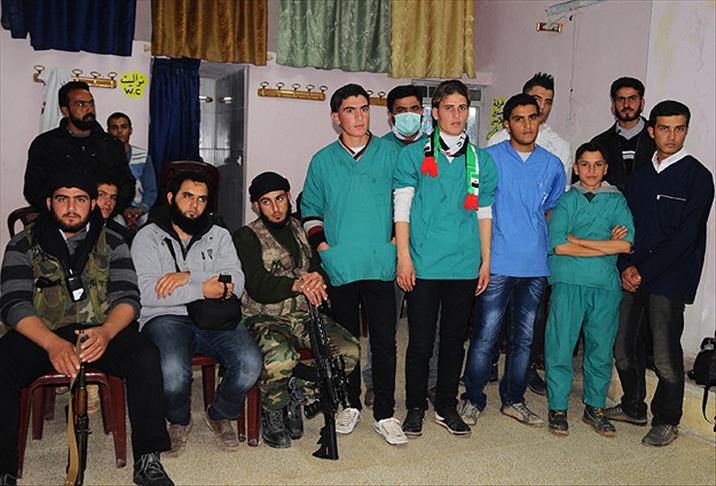 AA ekibi, Hatay'ın Altınözü ilçesine bağlı Hacıpaşa beldesine yaklaşık 2 kilometrelik mesafede yer alan ve yoğun çatışmaların ardından muhaliflerin kontrolüne geçen Derkuş kasabasında, sağlık kursuna katılan en küçüğü 16 yaşındaki gençleri görüntüledi.