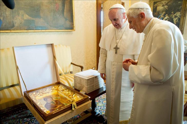 Ziyarette selefine Meryem Ana'nın bir resmini hediye eden Papa Franciscus, "Papalığınız sırasında gösterdiğiniz tevazu ve şefkatle herkese örnek oldunuz" dedi.