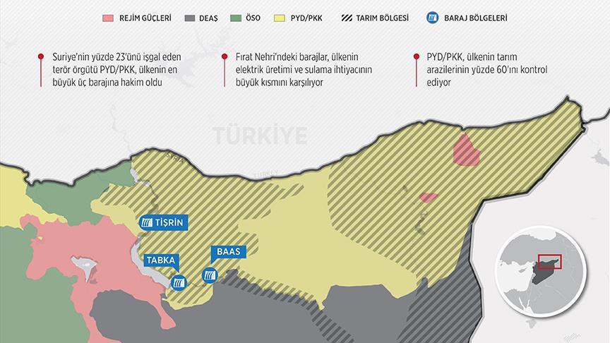 AA muhabirinin Dünya Bankası ve Suriye rejiminin Sulama Bakanlığı verilerinden derlediği bilgiler, örgütün ABD desteğiyle ele geçirdiği üç baraj sayesinde su, elektrik kaynağı ve tarım arazisi anlamında hassas bölgelere yayıldığını gösteriyor.