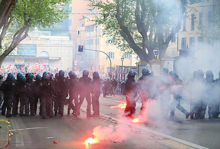 Polisin müdahalesiyle göstericiler Veneto Caddesi'nden Barberini Meydanı'na doğru dağılırken, yakılan çok sayıda meşale, atılan havai fişekler ve ses bombaları nedeniyle ortalık bir alanda savaş alanına döndü.
