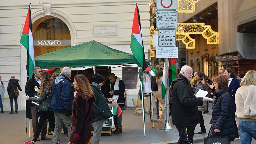 Trump'ın Kudüs kararının duyurulmasının ardından yüzlerce Filistinli ve Filistin gönüllüsü, ABD'nin Roma Büyükelçiliği önünde bu kararı protesto etmişti.