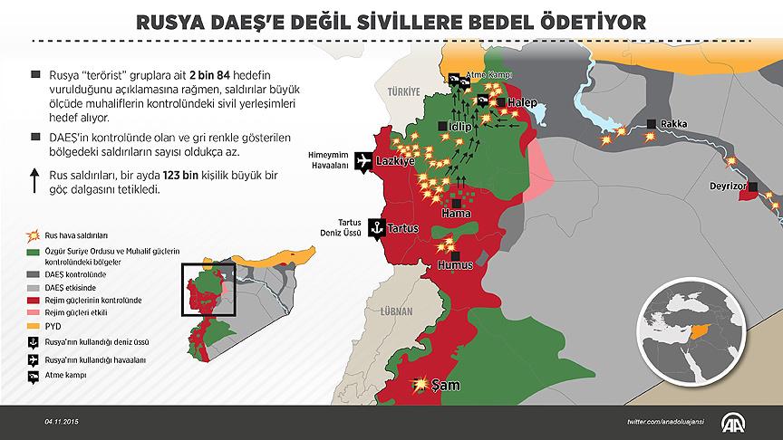 Rusya'nın Suriye'de "terörle mücadele" iddiasıyla düzenlediği hava saldırıları DAEŞ unsurlarından çok, ılımlı muhalifleri ve bu grupların kontrolündeki bölgelerde yaşayan sivil halkı hedef aldı. DAEŞ'in kontrolündeki noktalara düzenlenen Rus saldıları sınırlı kaldı.