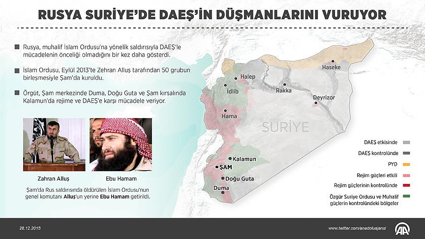 Rusya'nın son hedefi Şam ve çevresinde DAEŞ'e karşı etkin mücadele veren muhalif gruplardan İslam Ordusu oldu. 25 Aralık'ta İslam Ordusu'nun komutanı Zehran Alluş, Rus savaş uçaklarının saldırısında hayatını kaybetti. Yerel kaynaklar saldırının Rus jetlerinin diğer saldırılarda olduğu gibi yüksek irtifadan atışıyla gerçekleştirildiği belirtmiş, Rusya'nın resmi haber ajansı Ria'nın yurt dışı yapılanması Sputnik de saldırıyı Rus savaş uçaklarının düzenlediğini duyurmuştu. Ancak Rus yetkililerden ya da Esed rejiminden konuyla ilgili henüz resmi bir açıklama yapılmadı.