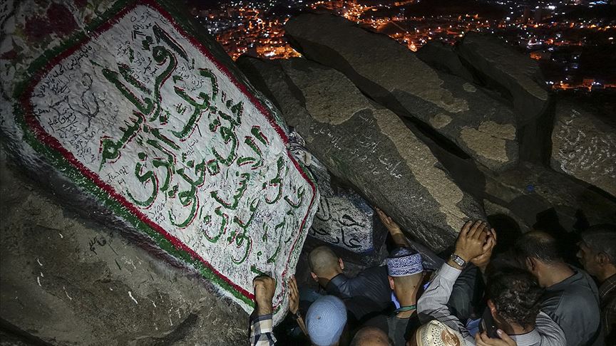 Henüz güneş doğmadan servis araçlarıyla Mekke'nin 5 kilometre kuzeydoğusundaki dağın çevresinde toplanan hacı adayları, bir saatlik zorlu yürüyüşün ardından zirveye ulaşıyor.