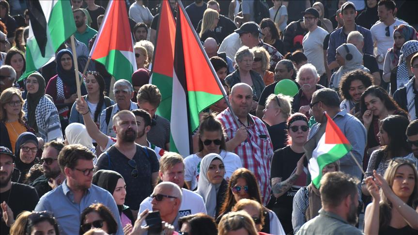 Aralarında, Filistin'in Stockholm Büyükelçisi Hala Fariz, Ship to Gaza Derneği Basın Sözcüsü Jeanette Escanilla, Yahudi asıllı İsveçli aktivist Dror Feiler ve sivil toplum kuruluşu temsilcilerinin de yer aldığı göstericiler, "Filistin yalnız değilsin", "Büyük Dönüş Yürüyüşüne selam olsun", "Kudüs Filistin'in Başkentidir", ''Filistin'e Özgürlük'' yazılı pankartlarlar ile Filistin bayrakları açtı.
