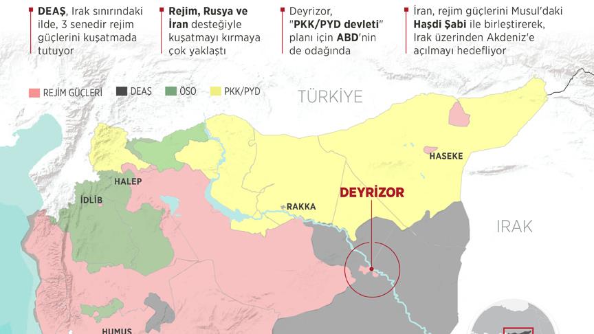 Suriye'nin Irak sınırında, DEAŞ kontrolündeki Deyrizor ili, iç savaşta söz sahibi aktörlerin yeni ilgi odağı haline geldi. Rusya ve İran destekli rejim güçleri, il merkezindeki kuşatmayı delmeye yaklaşırken kent, "PKK/PYD devleti" planı açısından ABD için de önem taşıyor.