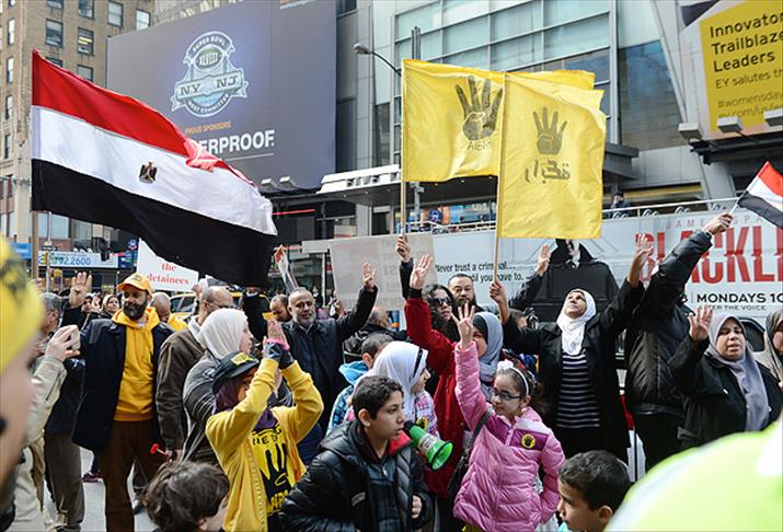 Times Meydanı'nda toplanan bir grup Mısırlı, ülkelerinde yapılan darbe ve darbe karşıtlarına yönelik şiddete tepki gösterdi. Çoğunluğunu kadın ve çocukların oluşturduğu protestocular, Rabia sembollü tişörtler giyerek İçişleri Bakanı Muhammed İbrahim ve Savunma Bakanı Abdulfettah es-Sisi aleyhine sloganlar attı. Hapiste tutulan ülkenin seçilmiş ilk Cumhurbaşkanı Mursi'nin serbest bırakılması çağrısını yineleyen protestocular, ''Askere suç için paraya hayır'', ''Hümokrasiye hayır, demokrasi istiyoruz'', ''Sisi reddedildi, Mursi seçildi' 'sloganları atarak Mısır'daki darbe karşıtlarına destek verdi.