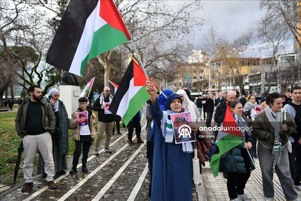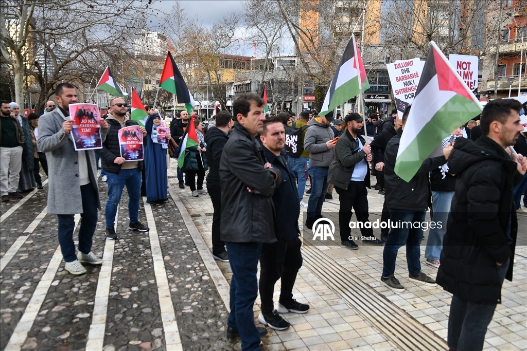 Arnavutluk'un başkenti Tiran'da düzenlenen Filistin'e destek gösterisinde, Başbakan Edi Rama'nın İsrail ziyareti protesto edildi.