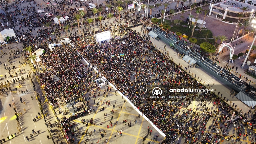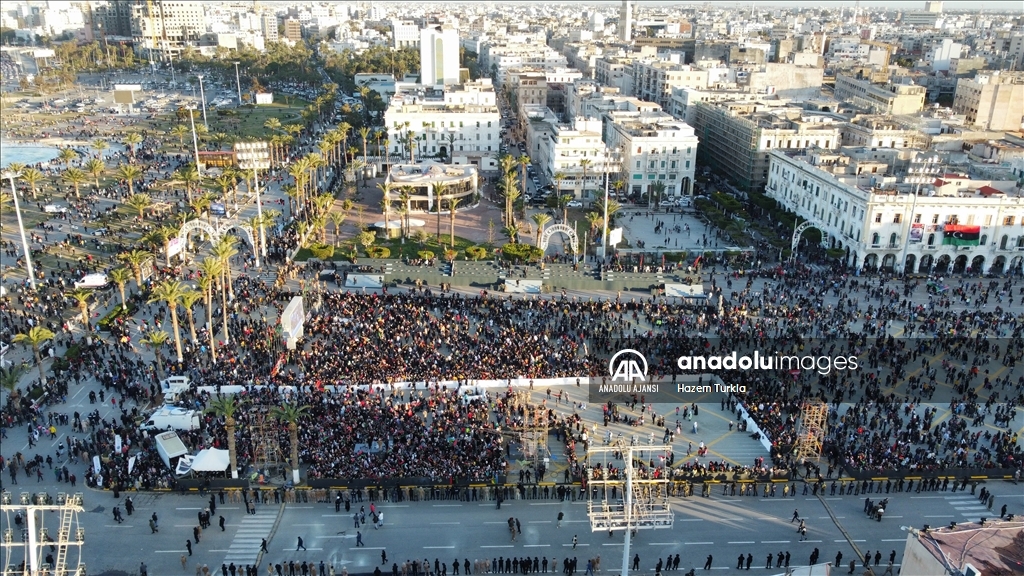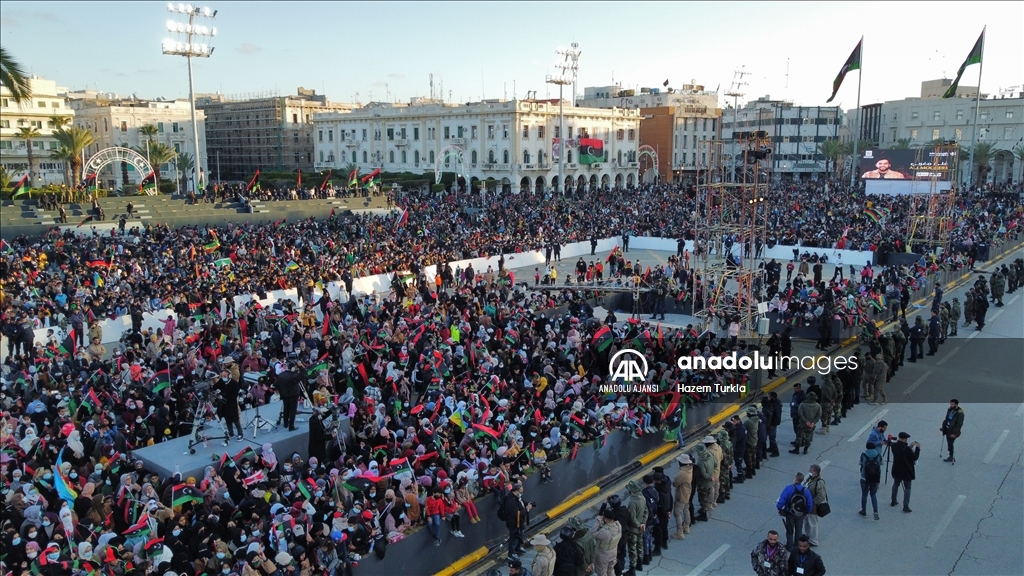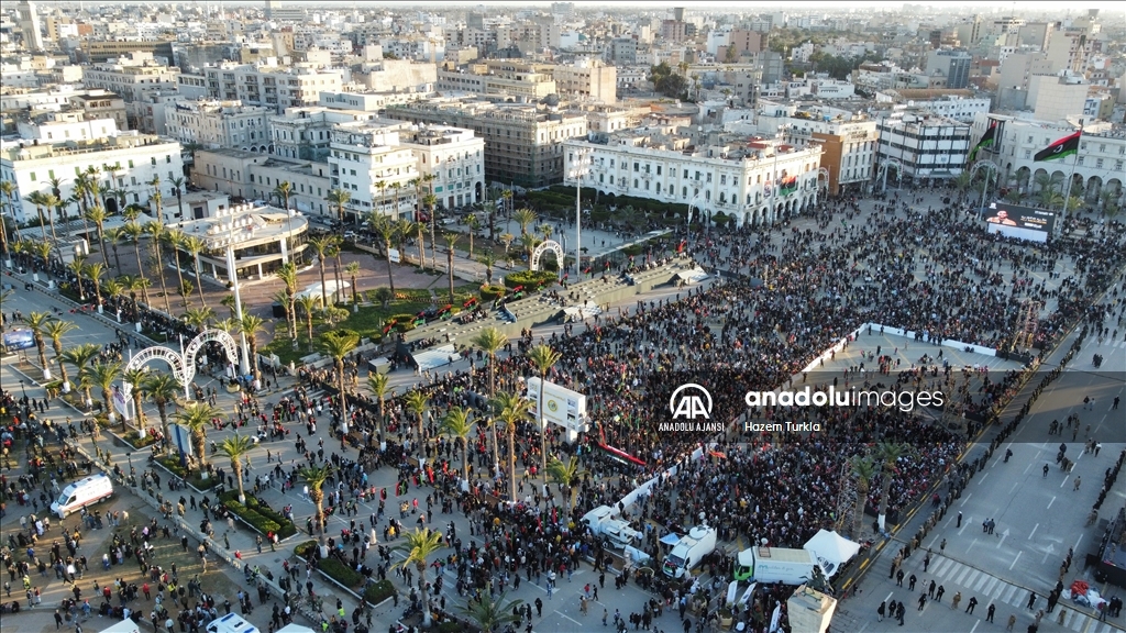 Trablus'un Şehitler Meydanı'nı dolduran on binlerce Libyalı, burada çalan şarkılara ellerindeki bayraklarla eşlik ederek devrimin yıl dönümünü kutladı.