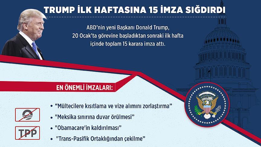 Görevinin ilk haftasında toplam 15 karara imza atan ABD Başkanı Donald Trump, "mültecilere kısıtlama ve vize alımını zorlaştırma", "Meksika sınırına duvar", "Obamacare'in kaldırılması" ve "Trans-Pasifik Ortaklığı'ndan (TTP) çekilme" gibi çok kritik ve tartışmalı vaatlerini yerine getirecek ilk adımları attı.