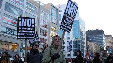 Müslüman Amerikalıların çoğunluğunu oluşturduğu yaklaşık 100 kişilik grup, "Faşist ABD'ye hayır", "Yasağa, duvara ve fişlenmeye hayır", "Herkes için demokrasi" yazılı pankartlar taşıdı.