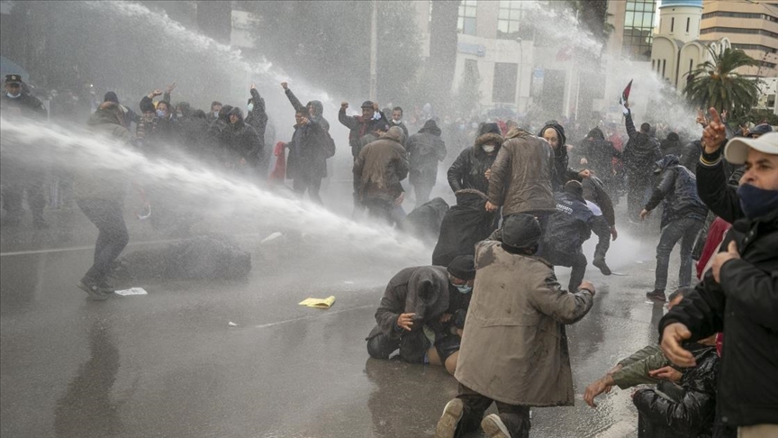 Polis, yaya giriş-çıkışına kapatılan Habib Burgiba Caddesi'ne girmeye çalışan eylemcilere tazyikli su ve gaz bombalarıyla müdahale etti.