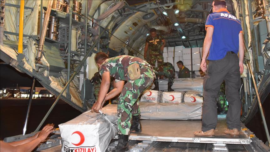 Türkiye'nin Endonezya'da yaşanan afetin ardından hazırladığı yardım malzemelerini taşıyan Türk Hava Kuvvetlerine ait C-130 tipi iki askeri kargo uçağı, TSİ 12.35'te Palu kentindeki Mutiara SIS Al-Jufrie Havalimanı'na indi.