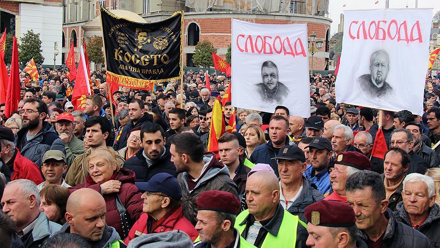 "Yunanistan ile müzakerelerin acilen sona erdirilmesi" çağrısı ile birçok sivil toplum kuruluşu tarafından "Makedonya" meydanında düzenlenen protestoya katılan binlerce kişi "özgürlük" yazılı pankartlar taşıdı.