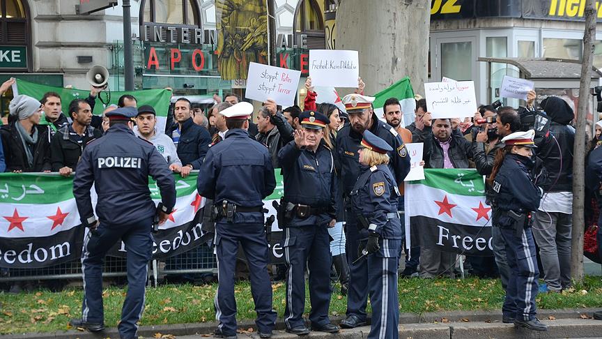 Avusturya'nın başkenti Viyana'da "Suriye" görüşmelerinin gerçekleştirildiği Imperial Otel'in önünde bir grup, İran, Mısır ve Rusya'nın görüşmelere katılmasını protesto etti.