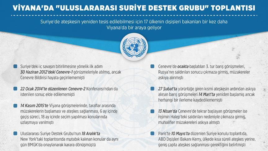 Suriye'de ateşkesin yeniden tesis edilmesi, abluka altındaki bölgelere insani yardımların ulaştırılması ve siyasi geçiş sürecinin hızlandırılması amacıyla düzenlenen "Uluslararası Suriye Destek Grubu" toplantısı, Avusturya'nın başkenti Viyana'da başladı.