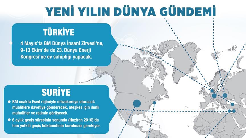 Suriye’deki iç savaş, DAEŞ sorunu, Ortadoğu’daki gelişmeler ve terör olaylarının 2016’da da dünya gündeminin ön sıralarında yer alması bekleniyor. Ancak dünya, 2016’da önemli seçimlere de sahne olacak. ABD yeni başkanını seçerken, Birleşmiş Milletler’de de Genel Sekreter Ban Ki-mun’un dönemi sona erecek.
