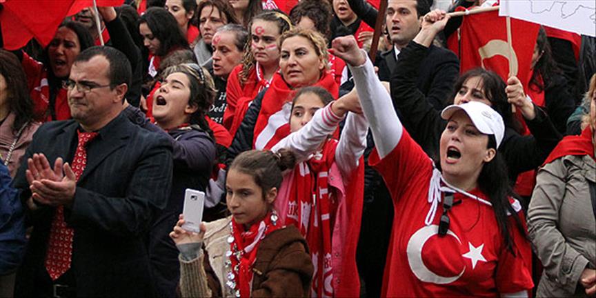 Türk bayraklarıyla miting alanında toplanan kalabalık grup, teröre lanet yağdırdı. Kuran-ı Kerim ve İstiklal Marşı'nın okunmasıyla başlayan mitingde, daha sonra şehitler için bir dakikalık saygı duruşunda bulunuldu