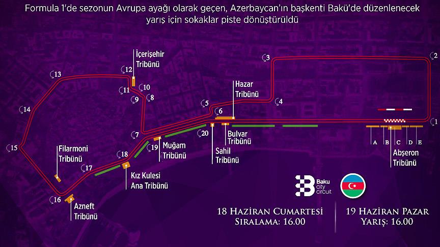 Formula 1'e ilk kez ev sahipliği yapacak Azerbaycan'da yarış hazırlıklarının sona ermesinin ardından geri sayım başladı. Başkent Bakü ile aynı adı taşıyan 6 bin 3 metrelik pistte 51 tur üzerinden yapılacak yarışın sıralama turu mücadelesi 18 Haziran'da TSİ 16.00'da başlayacak. Yarış da 19 Haziran Pazar günü aynı saatte gerçekleştirilecek.