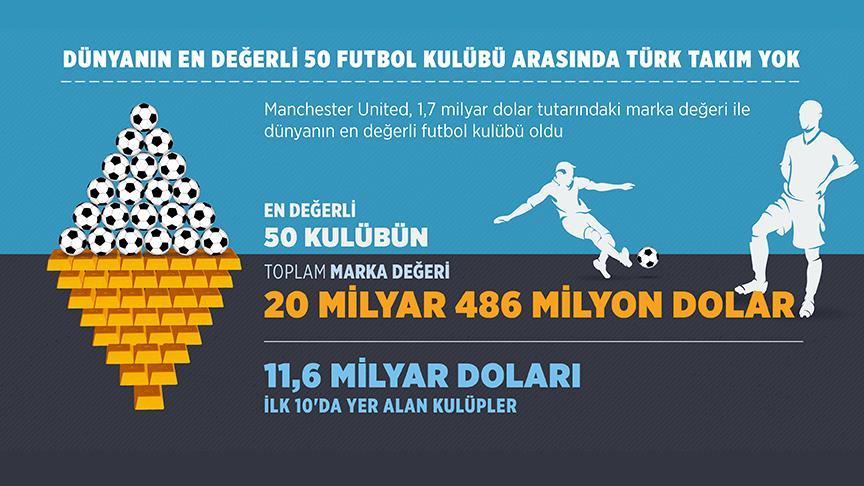 Buna göre, söz konusu listeye girebilen 50 futbol kulübünün toplam marka değeri 20 milyar 486 milyon dolar olurken, ilk 10'da yer alan kulüplerin marka değeri 11 milyar 616 milyon dolara ulaştı.