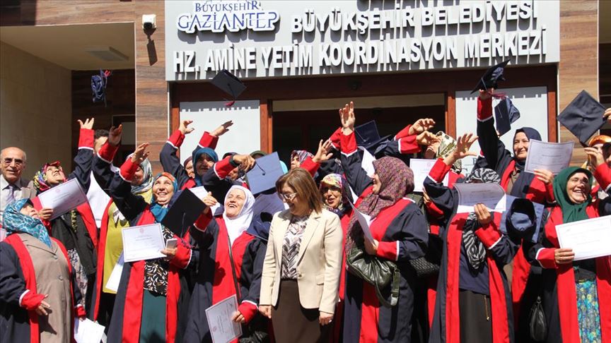 Gaziantep Büyükşehir Belediyesi Hz. Amine Yetim Koordinasyon Merkezi'nde okuma yazma kursuna katılan 40 yaş üzeri 29 kadın sertifikalarını alarak, kep atmanın sevincini yaşadı.